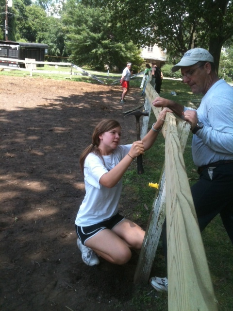 Another group eagerly greeted the founder of Work to Ride at her stable that houses 36 horse. Lezlie is still actively involved in the daily operation. Their biggest need was to repair and paint the existing fence for the horses. Our group learned to use a crow bar, level, power saw, hammer a nail, post hole digger, etc., while constructing the structure. Another group mastered landscaping at the agency by mowing grass, weed eating, pruning trees and mulching. It was truly life on the farm interacting with horses, goats, dogs, cats and children who were there to learn to ride.